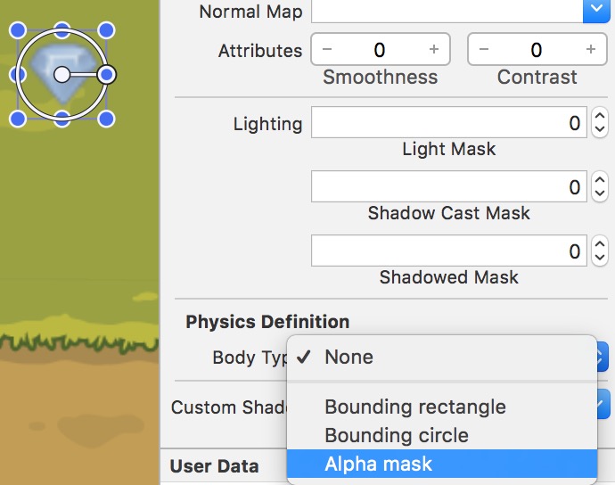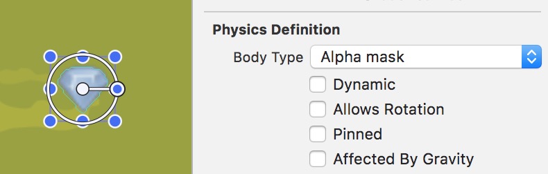 Finally we need to add a physics body. Switch back to the Attributes tab, and scroll down to Physics Body….