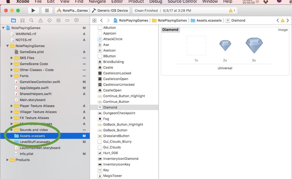 First up, we need to actually add your item to the SKS file (the scene). You can start by adding some new images to the Assets.xcassets catalog. Pro tip, if you name your images with @2x.png and @3x.png, you can drag and drop them from your Finder, straight into the catalog, and Xcode will put the images into their appropriate 2x and 3x slots.