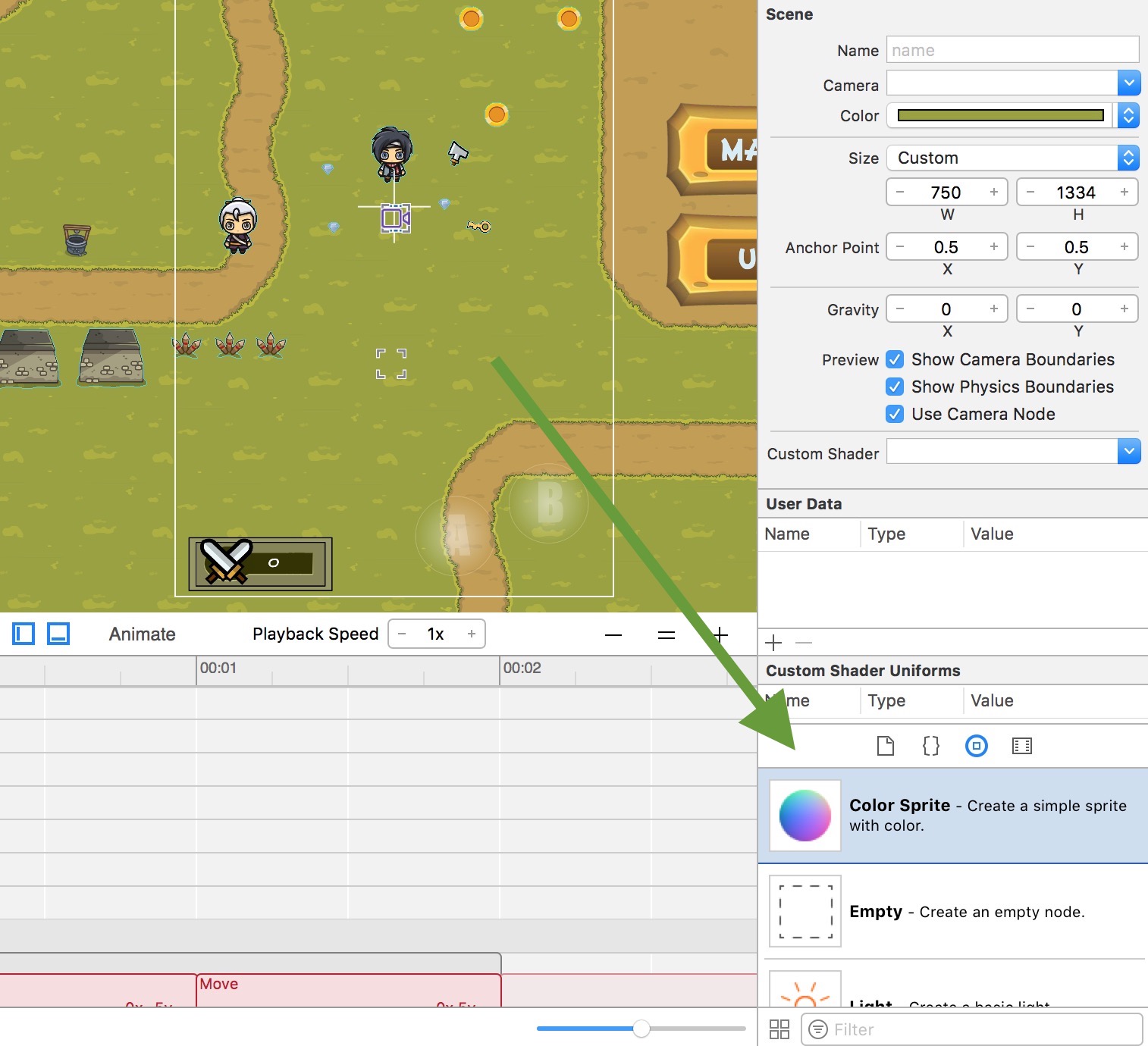 Next go to your scene and add a new Color Sprite (SKSpriteNode).