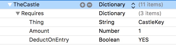 The Requires dictionary is used to make “opening” an item require something. Without the requirement, the item will not open (which for example, could prevent the player from being rewarded or using the item as a portal). Notice TheCastle item in the Grassland demo has the following requirements…