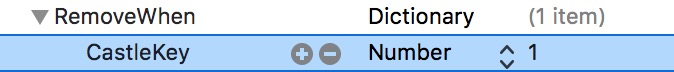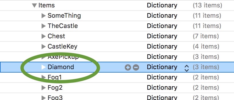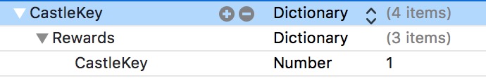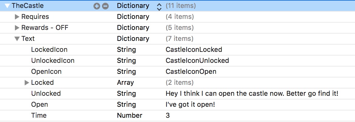 Notice the CastleKey item has a Rewards dictionary with the property key of CastleKey and a Number value of 1. So by contacting the CastleKey the player will also be storing one CastleKey in their inventory (later you’ll see how to make the item disappear on contact). Â Note that in this particular case the item and reward name match (both are CastleKey), but that’s not required. Any item can reward anything.