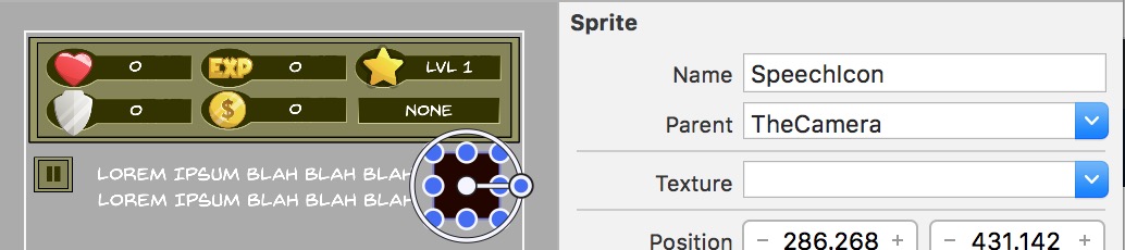 - LockedIcon – this is the name of the image in the asset catalog to show when the item is locked. This image will be shown where the SpeechIcon is in the GUI.sks file. For reference you can see where that is now…