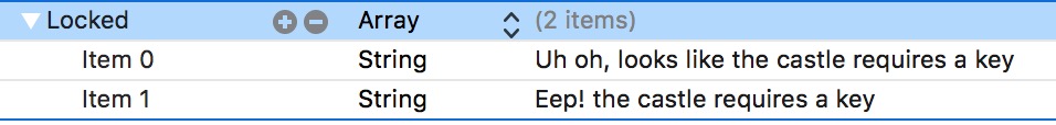 - Unlocked – just like the Locked property, this can be an Array or String value. Note this will appear as soon as the requirements for a particular item are met, even if the player isn’t in contact with the item.