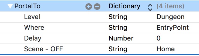 - Where – this is the name of a “dummy” node ( usually an invisible placeholder Sprite) in the level for the player to enter the scene at. Both the Grassland and Dungeon demo levels have an invisible node named EntryPoint.  Invisible, just means the Alpha on the sprite has been turned all the way to zero.