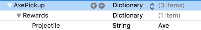- Projectile – the reward will be the name of an item in the Projectiles dictionary (in the Root). The player will switch to using this weapon. Players can switch weapons by tapping the weapon icon in the GUI. So for example, the Grassland demo level includes an item named AxePickup, and the Rewards dictionary has Projectile for the key name, and Axe for the value.