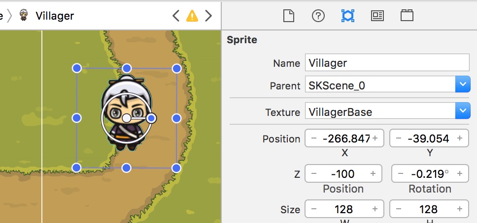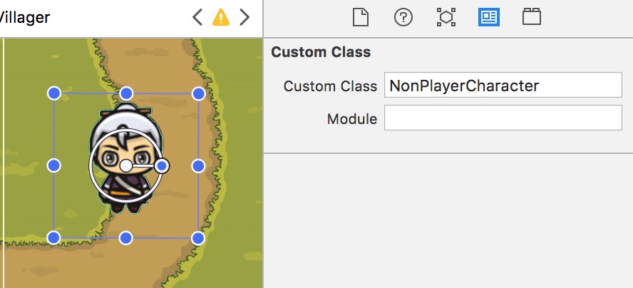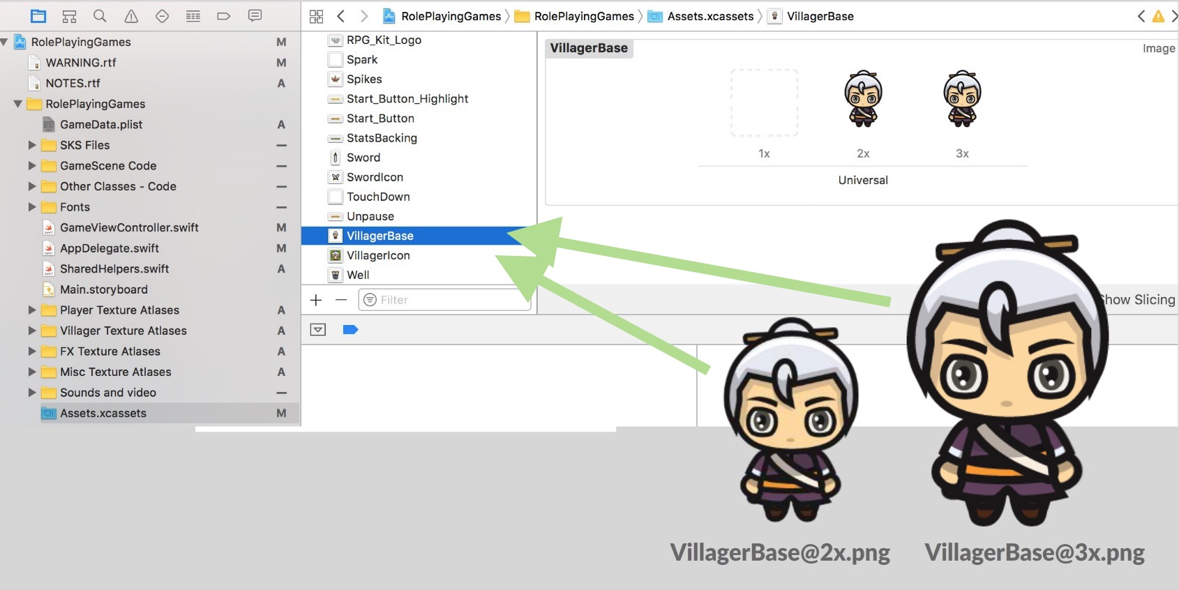 Add an initial image for the NPC to the Asset Catalog. As usual, if you drag and drop in images to Xcode with the @2x and @3x extensions they’ll automatically find their way into the appropriate 2x and 3x slots. And the base name of the source images is used as the asset name (VillagerBase)