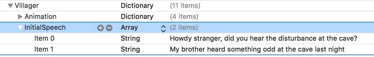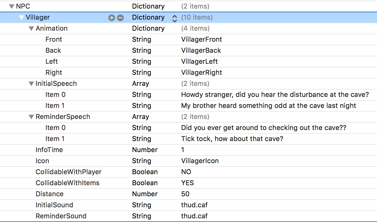 - Animation – this dictionary contains the Front, Back, Left and Right keys, each with String values that match the name of a saved action. Actions can be saved in any SKS file, but in the kit, we have a dedicated Actions.sks file for all the saved actions.  For example,you can save a sequences of animated textures, so for the NPC we would save 4 different actions, one for each directional walking sequence. To watch a video on how to save actions to an SKS file in Xcode, click here.