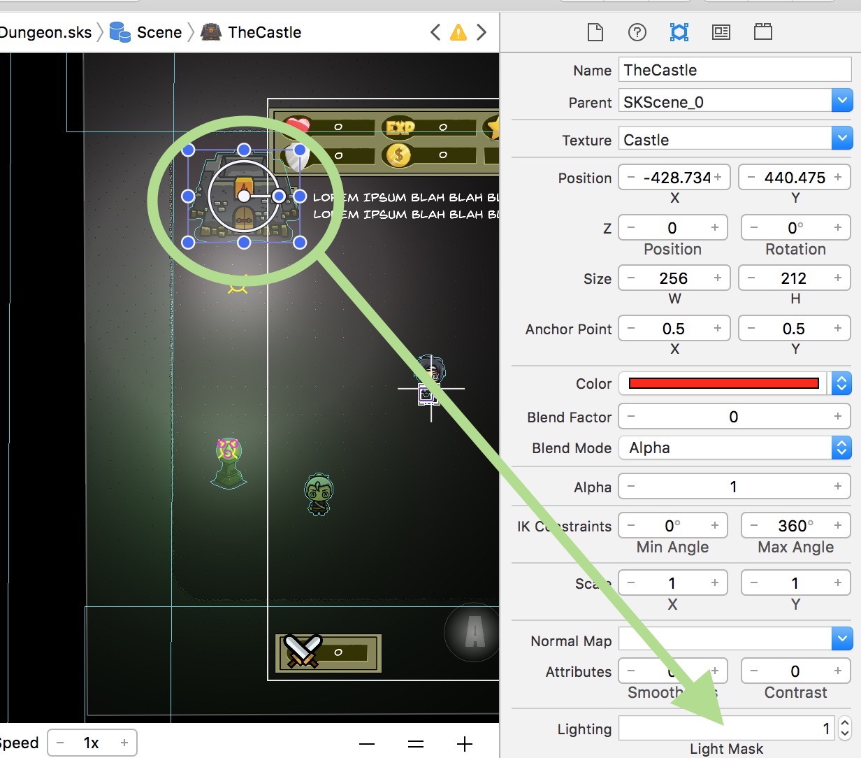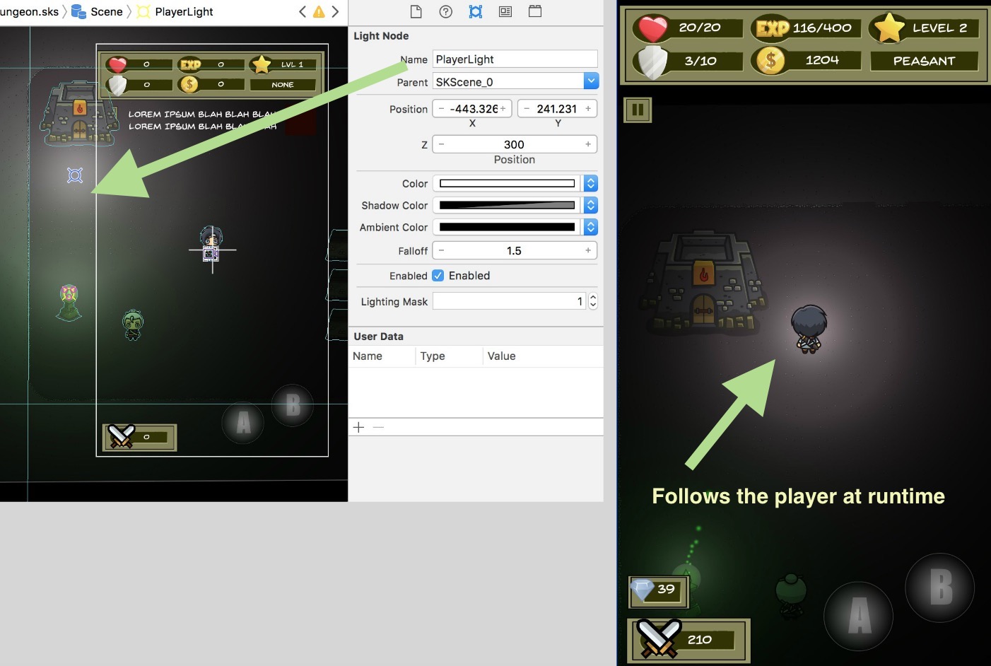 - LightFollowsPlayer – this is the name of an SKLightNode in the scene that you want to follow the player. For example, in the Dungeon level in the Kit, we set this value to PlayerLight, and you’ll see in the screenshot below where the PlayerLight initially is in the scene. But at runtime, the light stays attached to the player.