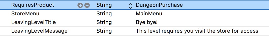 - RequiresProduct – a String value for the name of the In-App Product ID (as setup in iTunes Connect) that the user must have already bought to keep playing the level.