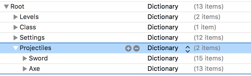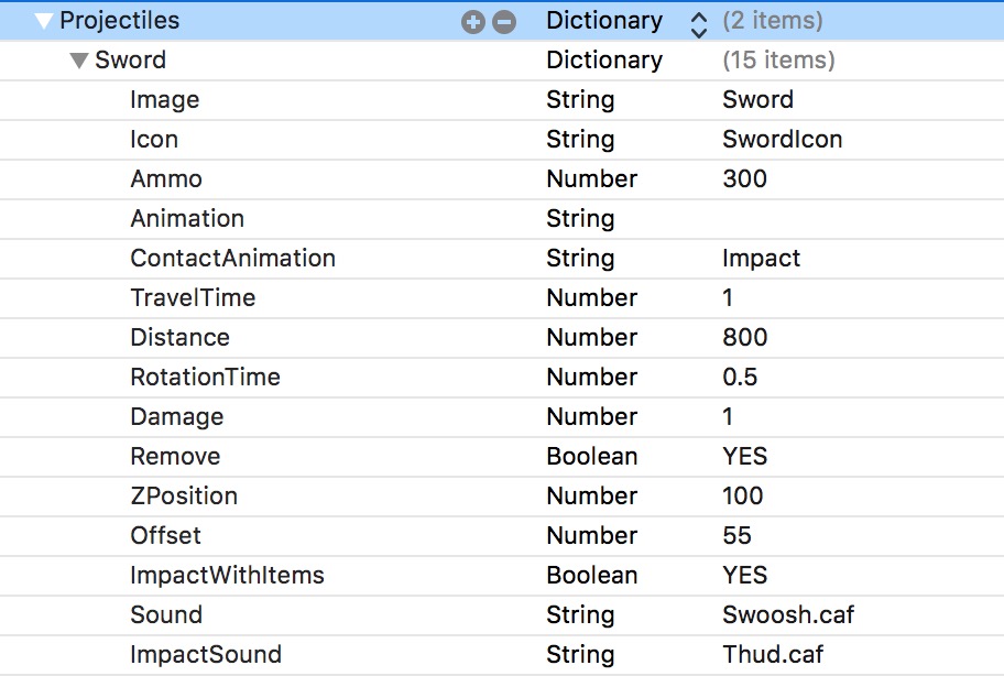The Projectiles dictionary in the Root of the property list stores info for every projectile, whether it’s meant for the player or an enemy. This way you can share projectile data between versions of the player or multiple enemies. So instead of having to re-define the same Sword data in every enemy, you can simply reference the a name in the Projectiles dictionary.