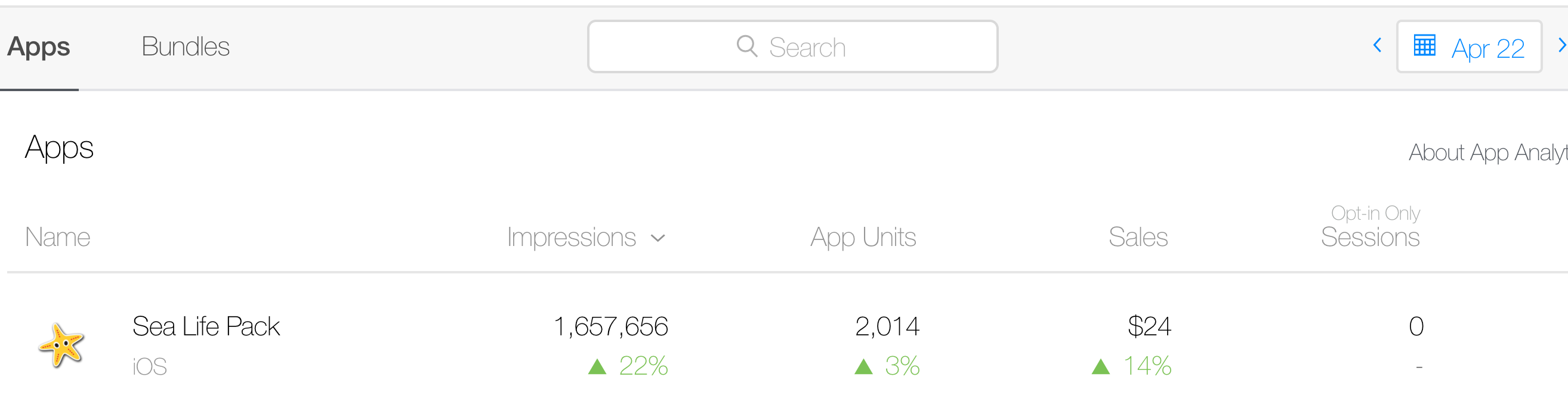 We were chit-chatting with Michael Goodman, a customer that used our Sticker Kit to make his Sea Life Pack app. He shared a great success story, and we asked him if we could just cut and paste some of what he told us here. Take a look at one of his daily sales snapshots and read part of what he told us below…