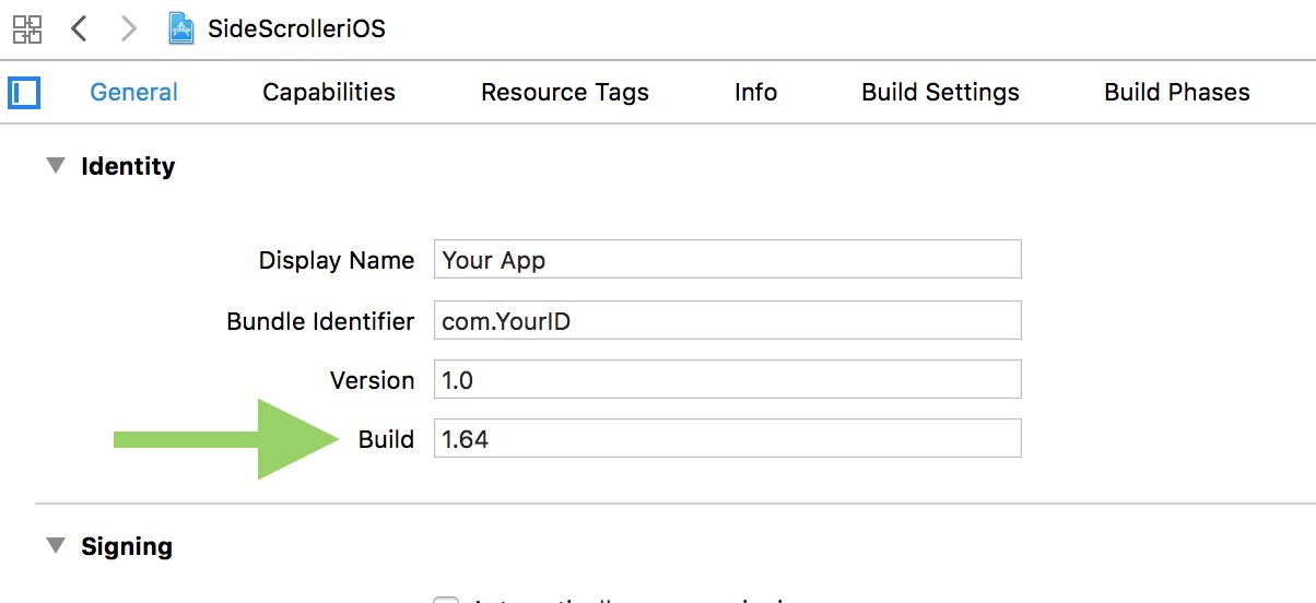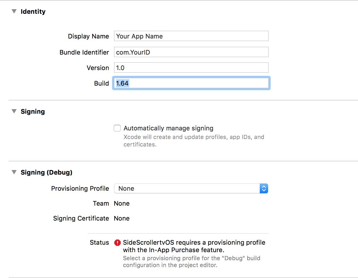 You want to head over to the General Settings tab and click on Automatically manage signing. Â Also at this point it’s a good idea to put in a Bundle Identifier unique to you. And you can change the Display Name (the Icon name on the home screen).