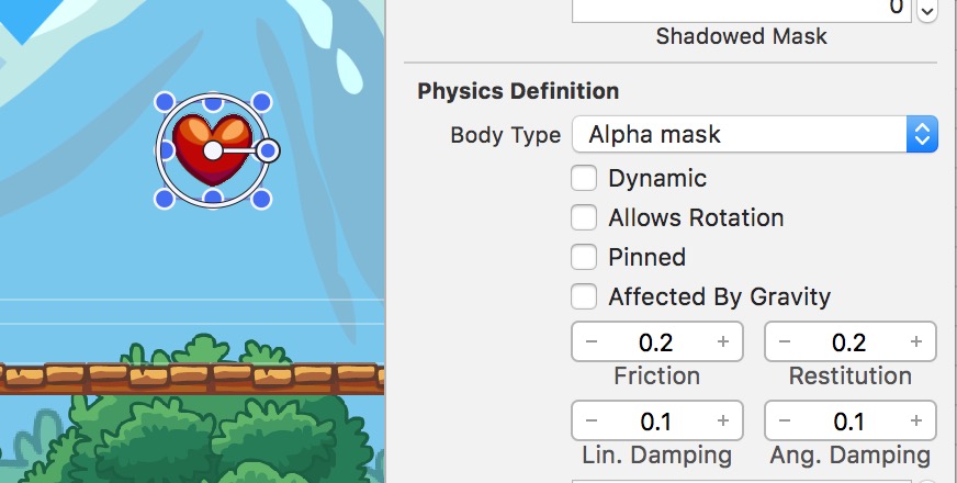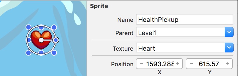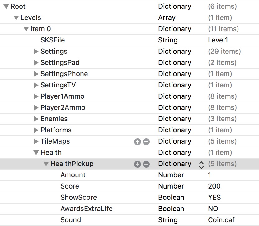 Add a Health dictionary to your level (or copy the existing one from one of the kits). Then within that, add a sub-dictionary with the same Name as the sprite in your scene. In this case, that’s HealthPickup. Â Within this dictionary you can set the following properties…