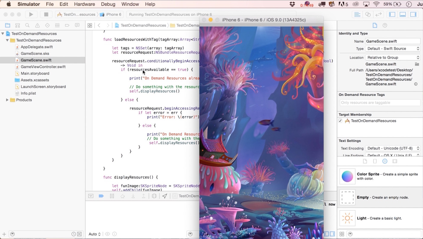 We can drip content to iOS9 users by adding On Demand Resource Tags. Content includes: images, folders of images, movie, sound files, you know, the big stuff. In the image below, you’ll see I’ve selected an image named Map, which is a slightly heftier file size compared to some others. Then in Xcode 7’s Attributes Inspector (circled in the top right), I’m giving it an On Demand Resource Tag name of MapTag.