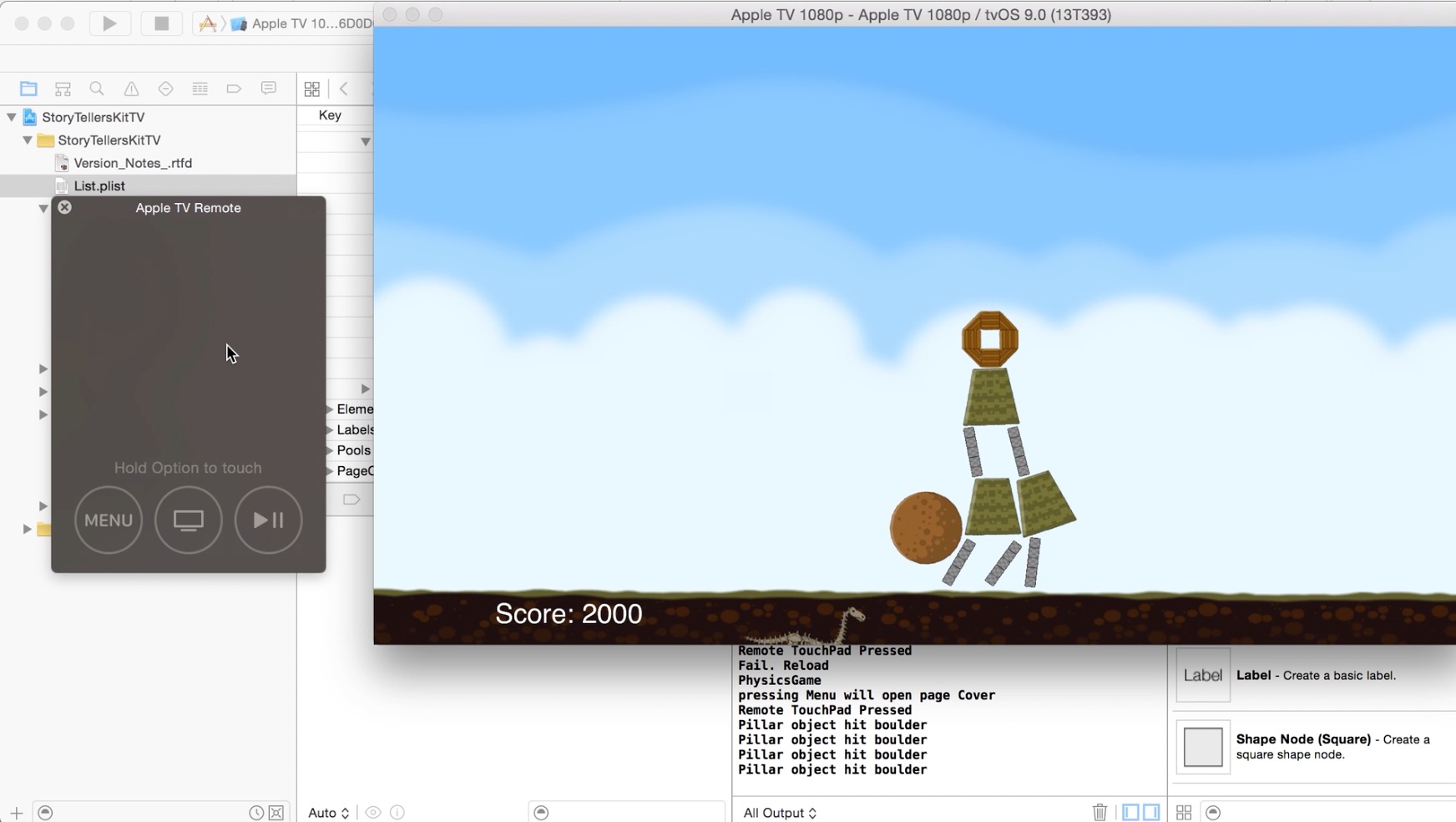 This quick video will show you how to make a physics game (similar to Angry Birds) with zero programming using the Story Tellers iOS / tvOS Starter Kit 2Â . You can create levels visually right within Xcode, then using simple properties define point values for collisions. If the player exceeds a certain score, they can move onto the next level. Otherwise they restart the level.