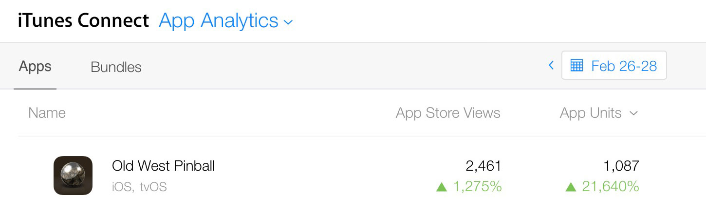 Almost half of every one in the iOS and tvOS store that saw the app downloaded it. And just in terms of visibility, those are high numbers. Implying “pinball” is probably being searched by a lot of people. So imagine if just 5%, were actual buyers. Even 1% would be significant.