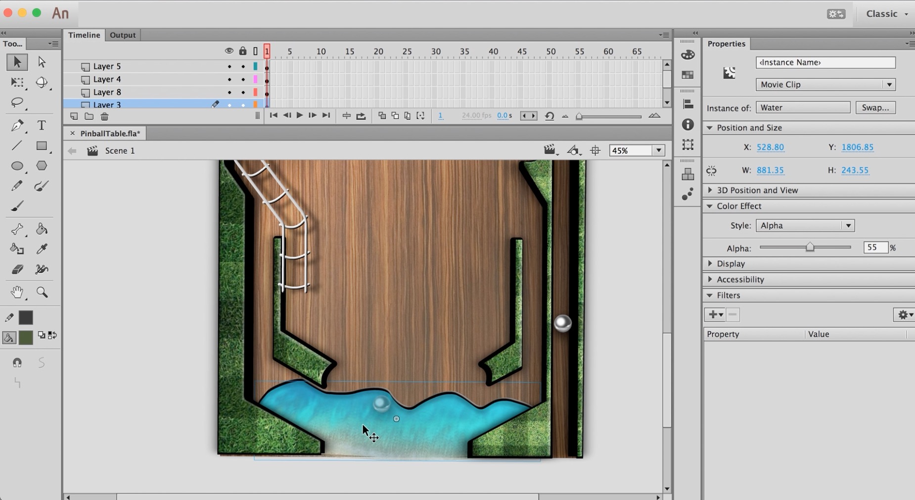 We’ll cover everything you’d expect to see a pinball table illustration course: the main table walls, ramps, bumpers, flippers, plungers, lights, table decoration and even some sillier things (like a giant bear head for the ball to roll through). We’ll also spend sometime animating objects like the bumpers, lights, even a waterfall.