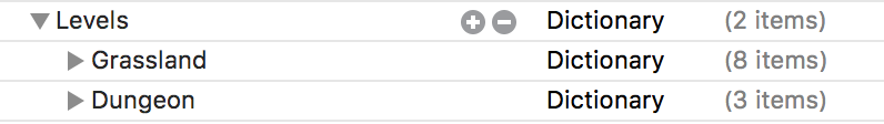 - Levels – this dictionary will contain all the levels for your game. You can include an unlimited number of levels, and each can be named anything you like. The kit already includes two levels, Grassland and Dungeon. So if you were to unfold the Levels dictionary, you would see these two sub-dictionaries below. Notice base names of these levels, match exactly the Grassland.sks file and Dungeon.sks files also included with the kit. This exact name match is what ties the level data to those particular SKS files (Scene Editor files, where your level is designed). Your individual levels will have sub-dictionaries for enemies, items level settings, and much more. Find out more about Levels here