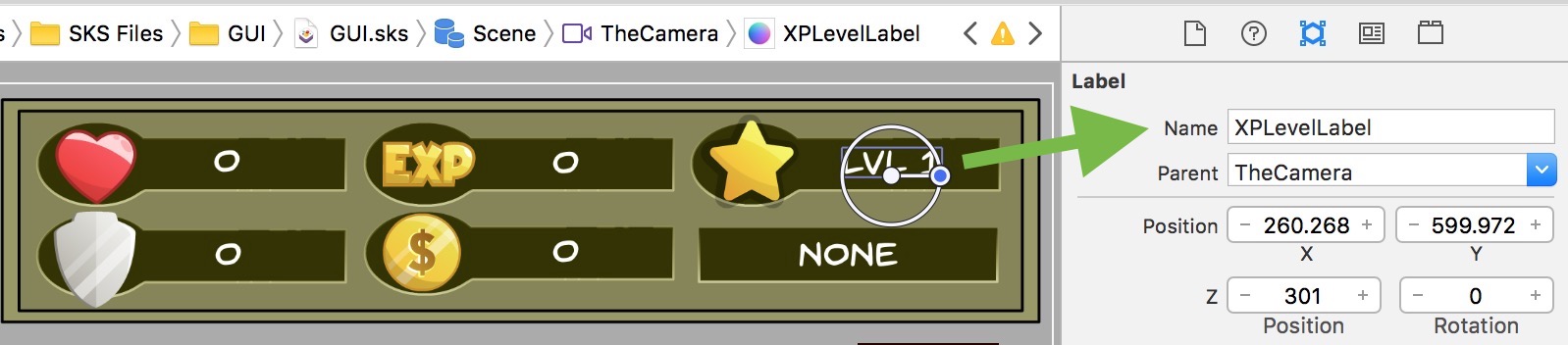 - Max – this is the max number of experience points needed to progress to the next XP level. So if you set 100, you need 100 to advance. The player’s XP stats appear in this format… current / max in the GUI. So for example, the GUI might read…  31 / 100 if you currently had 31 and needed 100. The label this appears in is called XPLabel (seen below).
