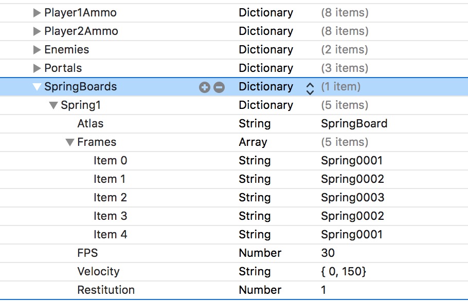 - Velocity – The velocity of the spring in { dx, dy } format. For example, a velocity written as { 0, 200} would only push the character upward on the y axis. a velocity of { 50, 200} would push the character the same amount on the y axis, but also forward on the x axis.