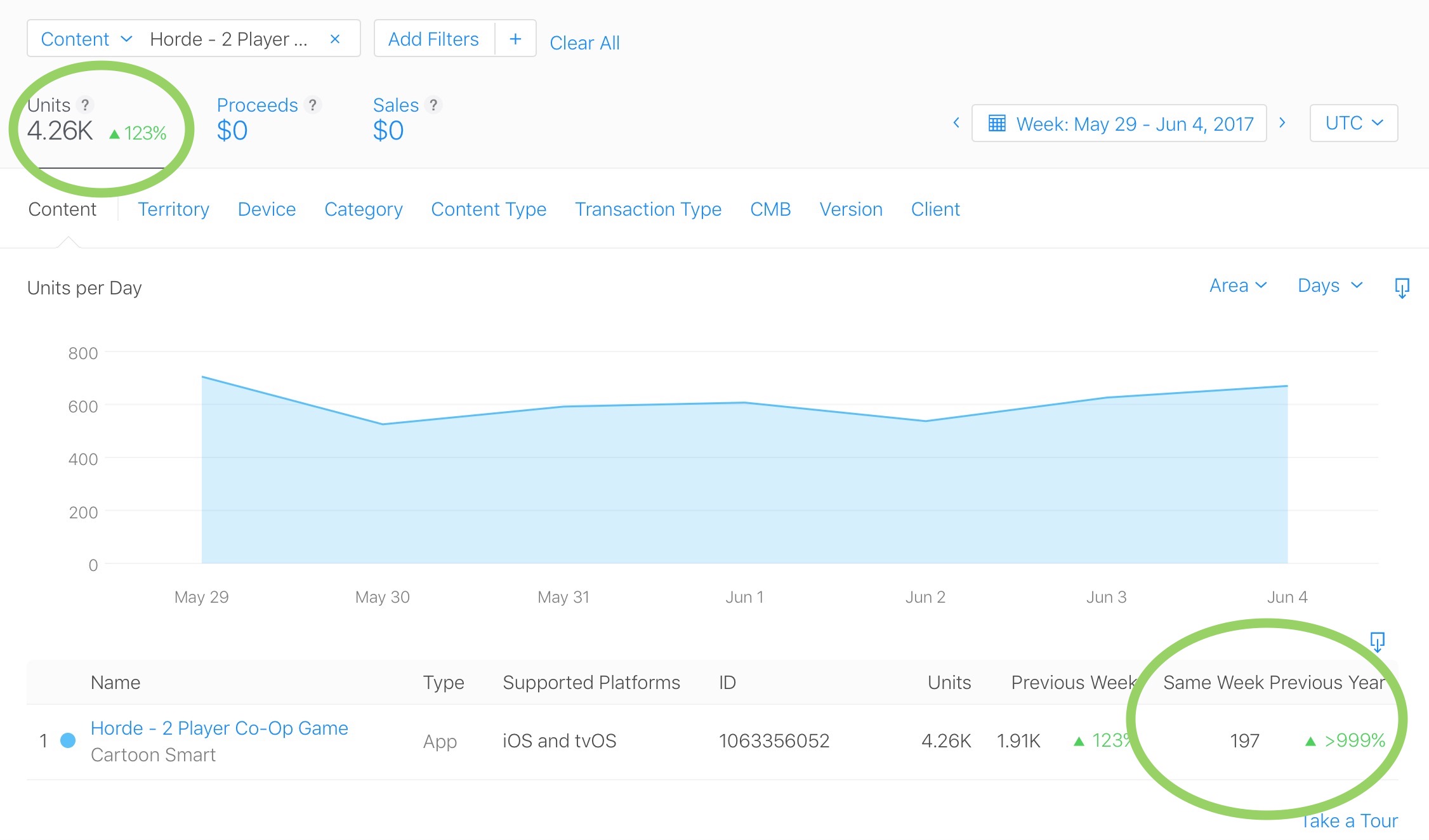 This is a relatively simple game, setup identical to the original Mario Bros. So it’s fun as hell, especially with an external game controller on tvOS, but we do relatively nothing to promote it. Yes there’s a link on a couple pages on our site, but we don’t have the kind of traffic that accounts for the thousands of downloads each week in the store (if only). But that’s what is important to look at here. Check out what the same app was doing this time a year ago: 197 downloads. Over 999% growth, for doing nothing but sitting tight.Â
