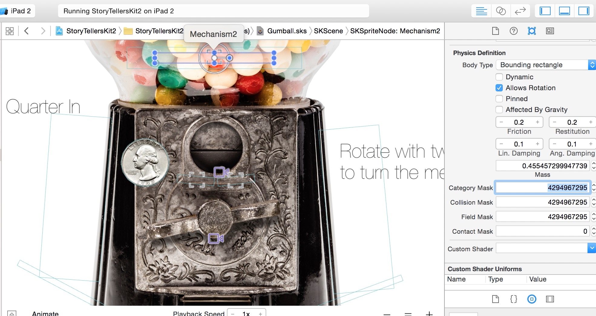 This video discusses the properties used to set up the gumball machine example in the Story Tellers iOS Starter Kit 2. The user can drop a quarter into the coin slot, turn the crank and the quarter drops out. Okay, okay, thats not exactly how a gumball machine works, a gumball would normally drop out, but for kids that just love putting quarters into machines (like mine), this will satisfy them. You’ll get an under-the-hood look at the physics inside the kit and how you can work with them through simple properties.
