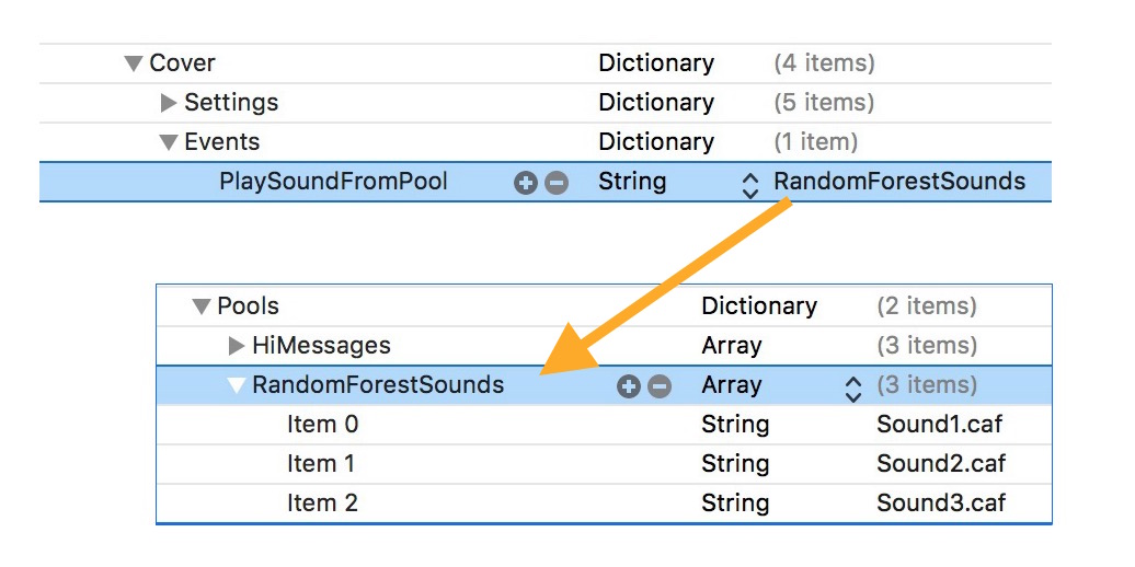 - PlaySoundFromPool – enter the name of a pool array containing an unlimited number of sound files. For example…